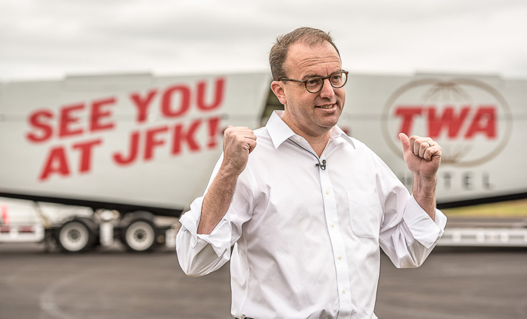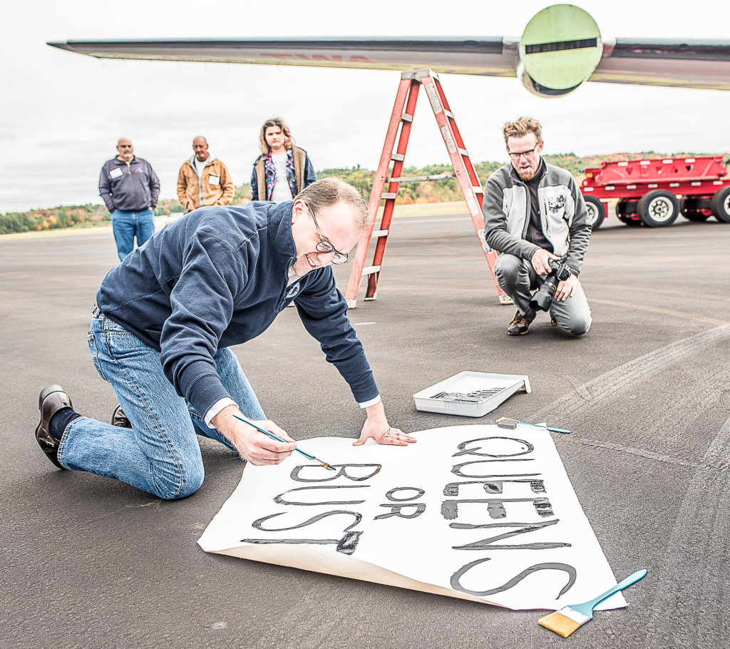 During a ceremonial send-off Monday, Tyler Morse, CEO of MCR and MORSE Development, the company behind the TWA Hotel project, hand-painted a “Queens or bust!” sign and hung it on the back of the 150-foot fuselage as it sat on the back of a flatbed at the airport.
