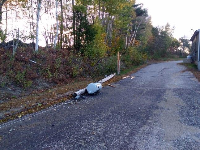Two power poles at the Wilton Transfer Station on the Munson Road were snapped overnight Monday into Tuesday due to high winds. The facility is closed Tuesday, Oct. 16, and possibly Wednesday while power is restored. (Courtesy photo)
