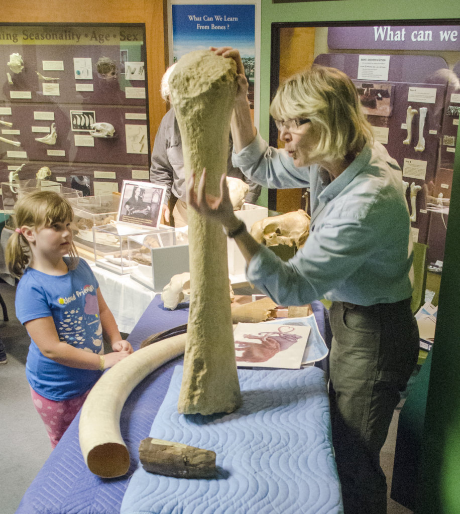 Marie Perin of Newburgh listens as Paula Work, the museum’s curator of systematic collections, holds a whale rib bone as she talks Tuesday at the Maine State Museum in Augusta. The museum had free admission on Maine Earth Science Day on Tuesday. (Joe Phelan/Kennebec Journal)