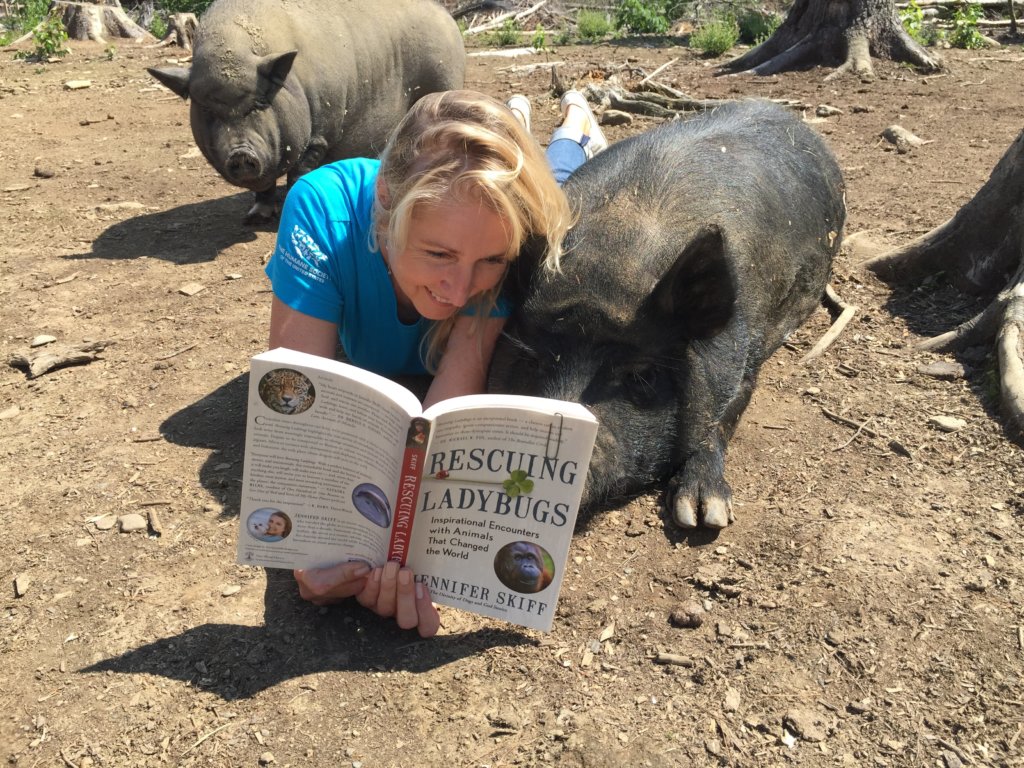 Jennifer Skiff entertains Minerva the pig at Peace Ridge Sanctuary in Brooks, Maine, with her latest book, “Rescuing Ladybugs.” (Photo courtesy Jennifer Skiff)