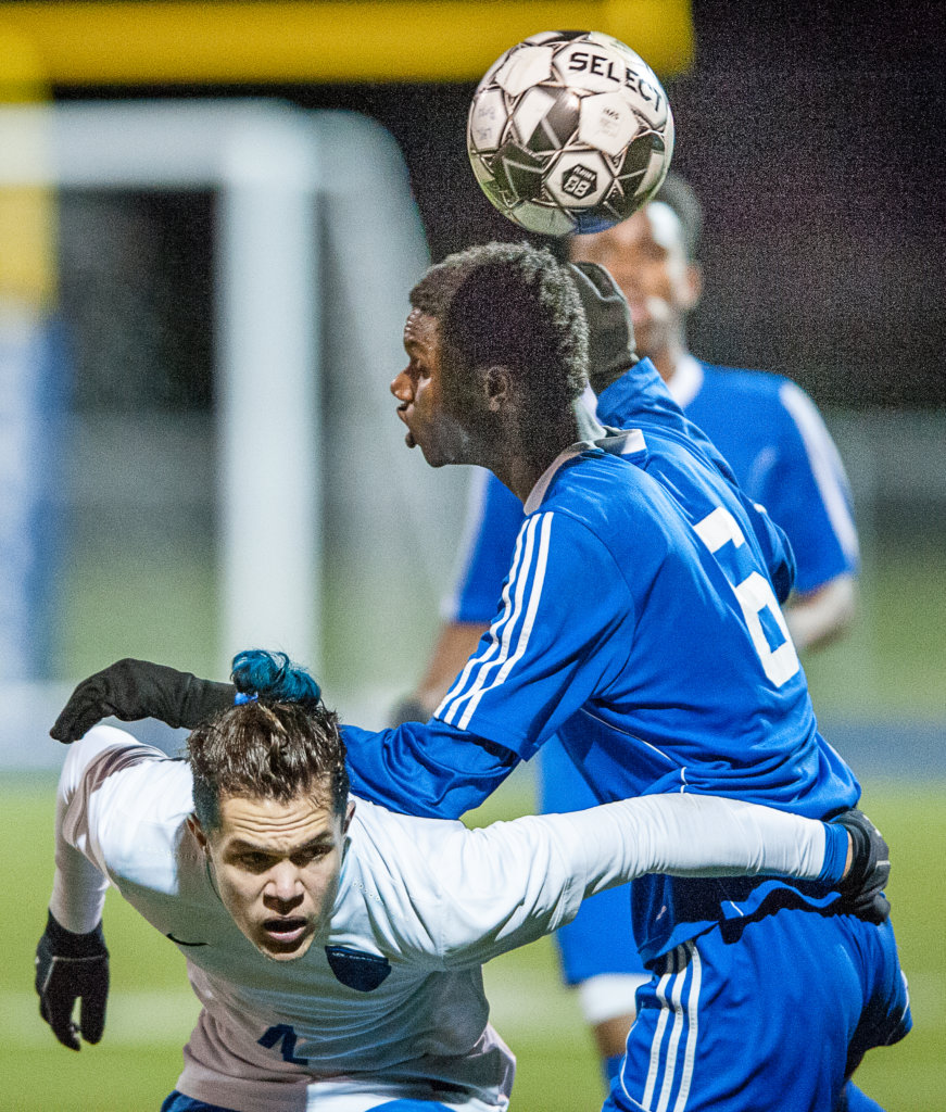 Mt Ararat’s Nate Taylor, left and Lewiston’s Hussein Hassan battle for the ball during Wednesday’s championship game in Lewiston. (Russ Dillingham/Sun Journal)