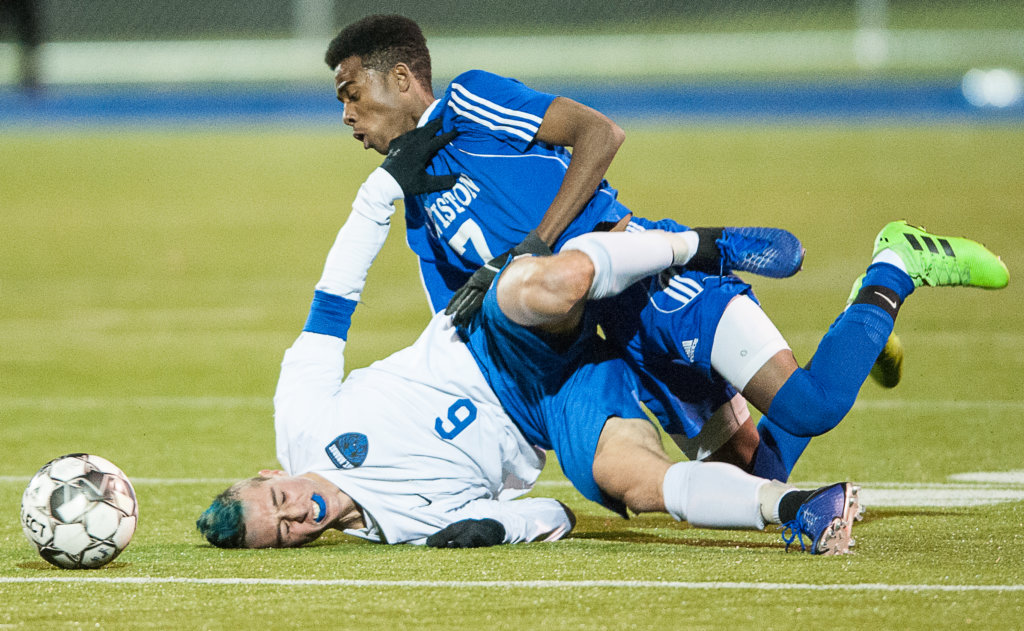 Mt. Ararat’s Max Spelke, left and Lewiston’s Jama Abdullahi get tangled up going for the ball during Wednesday’s championship game in Lewiston. (Russ Dillingham/Sun Journal)