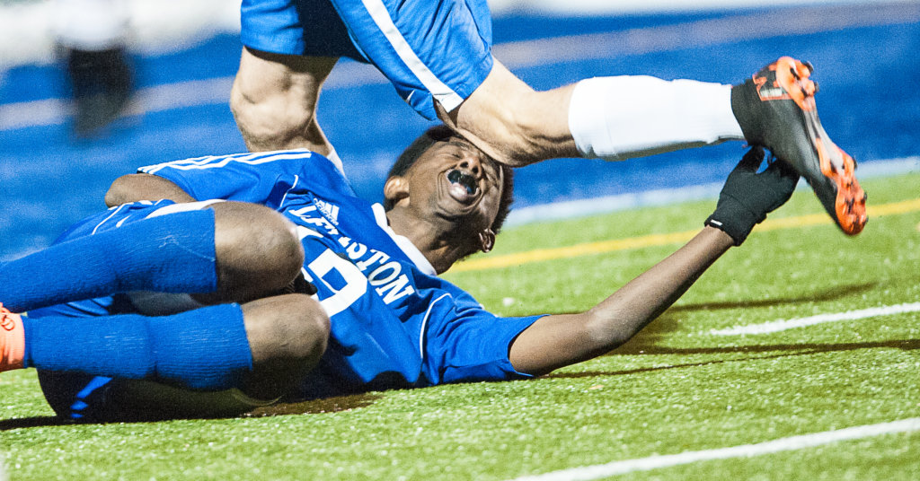 Lewiston’s Suab Nur gets a knee to the head by Mt. Ararat’s Kody Noyes that led to a penalty kick during the first half of Wednesday’s championship game in Lewiston. (Russ Dillingham/Sun Journal)