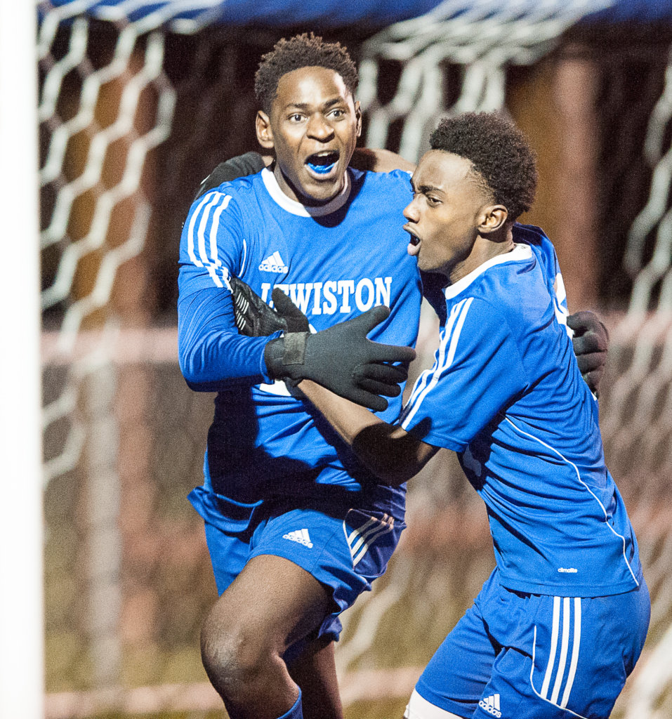 Lewiston’s Joel Musese, left and Suab Nur celebrate Musese’s goal in the first half of Wednesday’s game that was the only scored in the game as Lewiston advances to Saturday’s starte championship game after defeating Mt. Ararat 1-0 in Lewiston. (Russ Dillingham/Sun Journal)