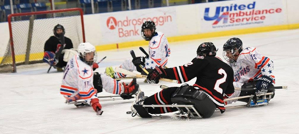 In this still shot from a New England Warriors sled hockey game, in the white jerseys, from left are John Curtis, Josh Gould and Will Rolfe.