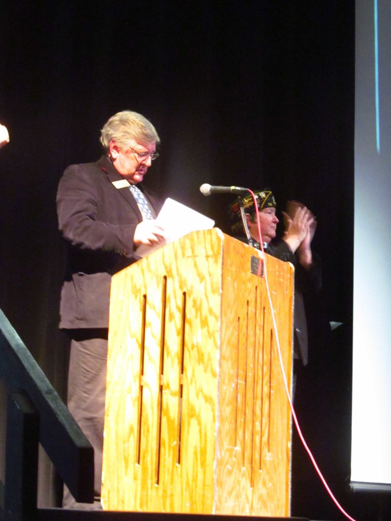 Ben Tucker, left, speaks on behalf of U.S. Sen. Angus King at the Veterans Day ceremony Monday morning at Oxford Hills Comprehensive High School in Paris. Sarah Glynn, Americanism officer for Foster-Carroll Post 72 of the American Legion, applauds. (Matthew Daigle/Sun Journal)