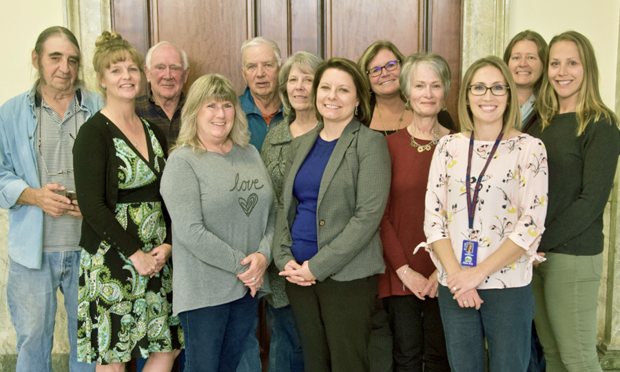 Tavia Melhus, center, newly hired River Valley Healthy Community Coalition executive director, meets with board members and employees. From left are Nick Waugh, Rebecca Record, Paul Jones, Melanie Babb, Dick Lovejoy, Kim Sequoia, Melhus, Becky Hall, Laurie Windsor, Jill Bartash, Allie Burke and Melissa Harding.