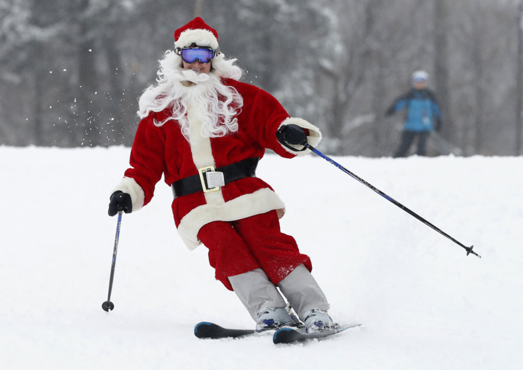 A skier dressed as Santa Claus heads downhill during the annual Santa Sunday event, Sunday, Dec. 2, 2018, in Newry, Maine. The red-suited lookalikes aim to put a smile on people’s faces while raising money for charity. (AP Photo/Robert F. Bukaty)