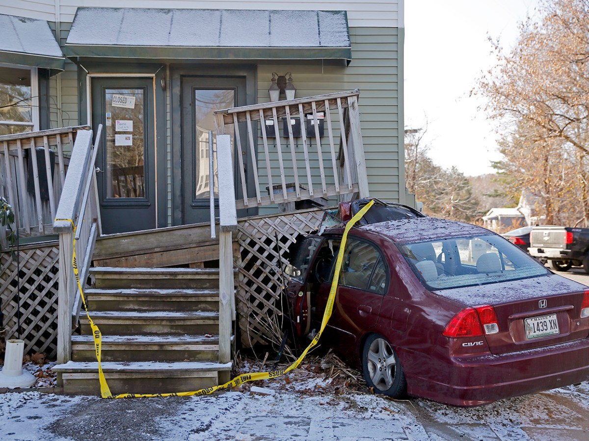 The vehicle was turning into the parking lot at The Sinful Kitchen on Brighton Avenue when it slid out of control and plowed into the building’s front deck.