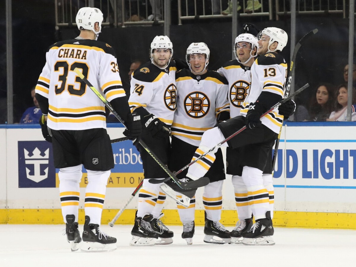 Brad Marchand (two goals, three assists) and Patrice Bergeron (hat trick) lead Boston to its eighth win in 11 games.