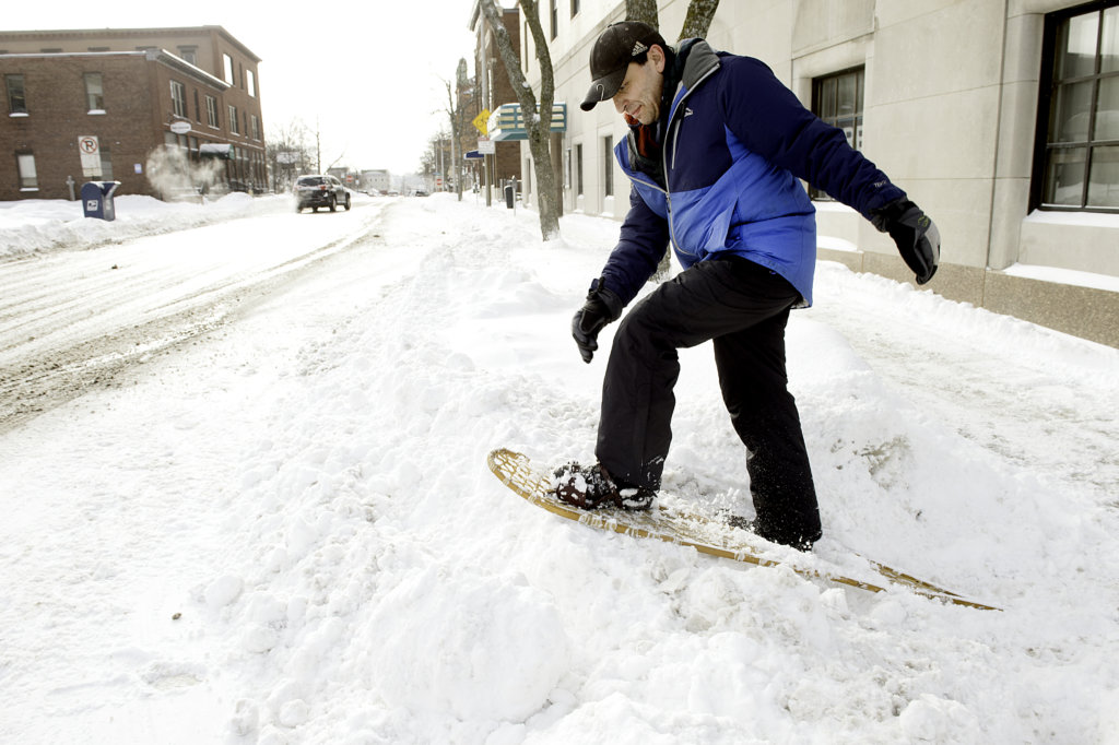 Randy Berry of Lewiston snowshoes through downtown Lewiston on Wednesday. About 5 inches of snow fell on the Twin Cities, canceling school in both Lewiston and Auburn. “I love shoeing,” Berry said. “I’ve been shoeing since I was a kid.” (Sun Journal photo by Daryn Slover)