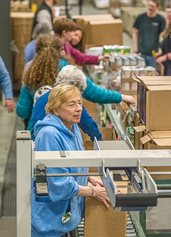 Gov. Janet Mills works on the line at the Good Shepherd Food Bank in Auburn on Saturday helping box up food as part of the “Day of Service” organized by her transition team. The volunteers packaged 720 boxes of supplemental food. (Sun Journal photo by Andree Kehn)