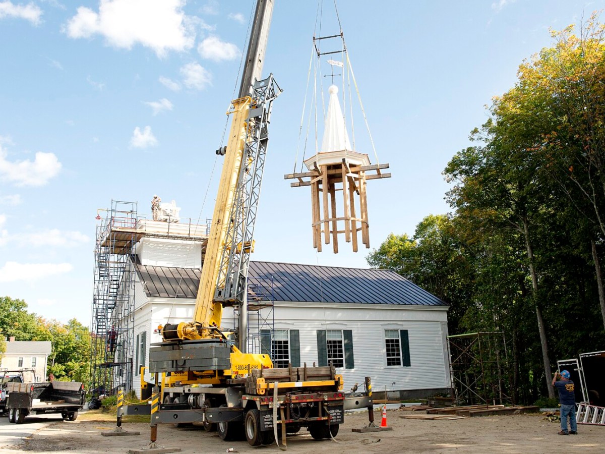 The steeple, bell and bell housing on Lewiston-Auburn’s oldest church was put back in place after undergoing a year-long restoration.