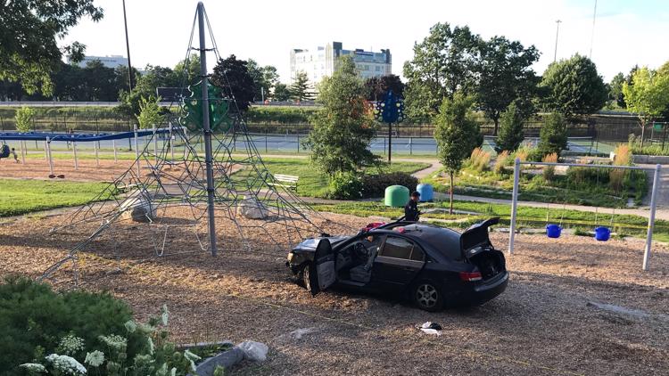 The driver was charged with OUI and other offenses after the incident Sunday evening at Deering Oaks, police say.