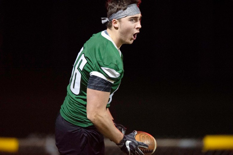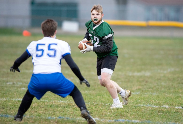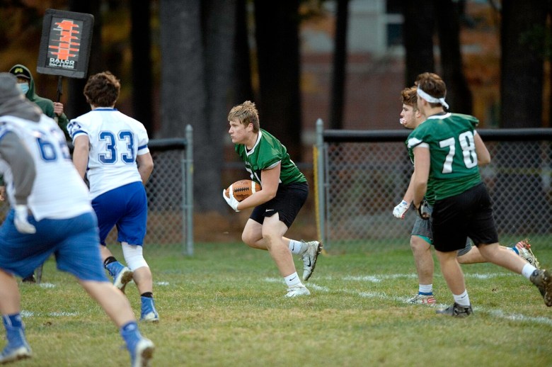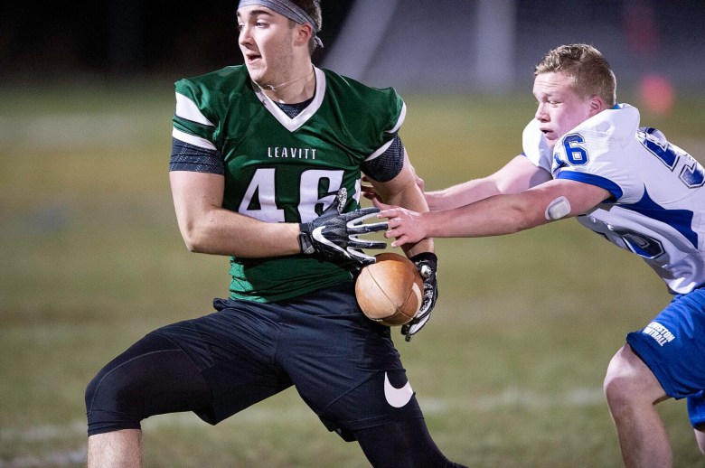 Tight spirals and a cannon arm helped make Mayo look the part of a quarterback, as did his connection with Tommy Casey, who made a leaping catch and ran the rest of the way for a 26-yard score. A deflection off a defender caught by Leavitt’s Landen Arsenault on the ensuing two-point conversion tied the game and served as a reminder that no pass Tuesday could be taken for granted.