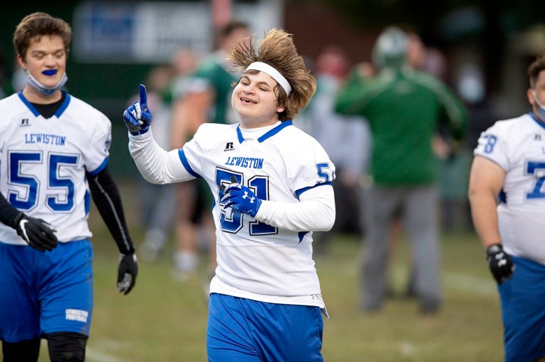 “We like to throw the ball around before practice,” Lewiston lineman-turned-quarterback Matthew Dube said. “We think we’re skill guys, but we’re not, because we got bellies.”