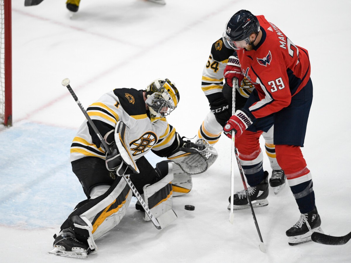 Michael Raffl scores the winning goal with 1.8 seconds left for the Caps, who meet the Bruins in the playoffs starting Saturday.