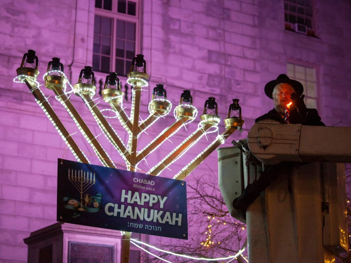Cars with menorahs on top parade through the streets of Portland to reach City Hall, where Rabbi Moshe Wilansky of Chabad Maine lit a 12-foot tall menorah on the first night of Hanukkah.