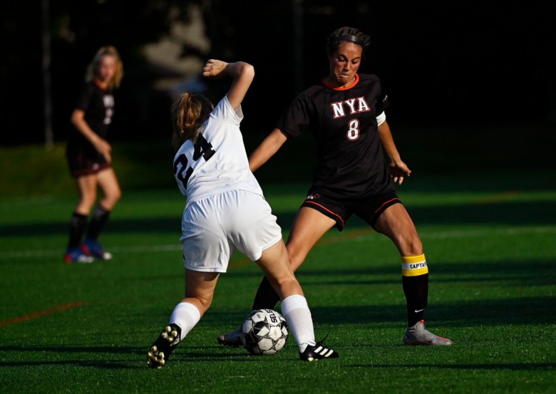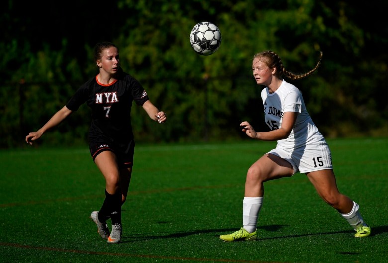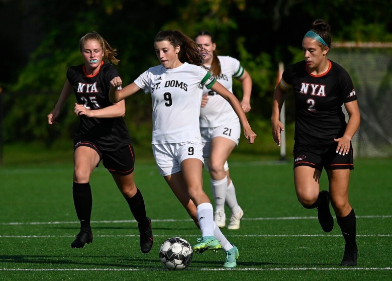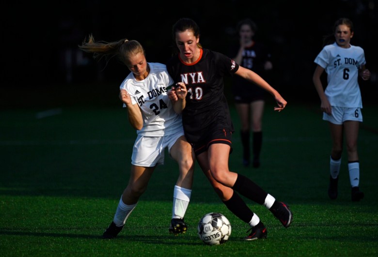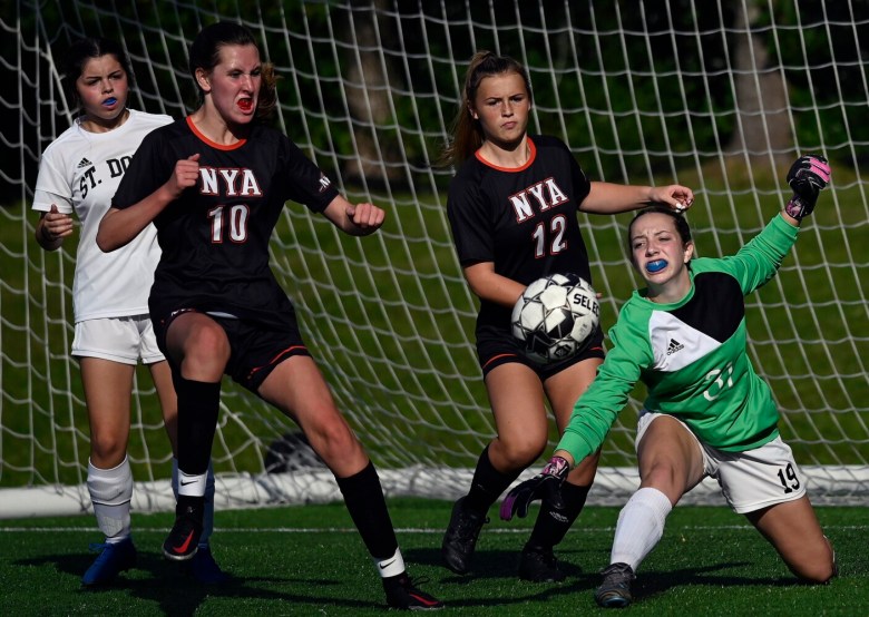 NYA was frustrated by St. Dom’s freshman goalkeeper Anna Theriault (33 saves) the rest of the half and into the second, but with 22 minutes to go, Emily Robbins scored from Vy Tran for a 3-0 advantage.