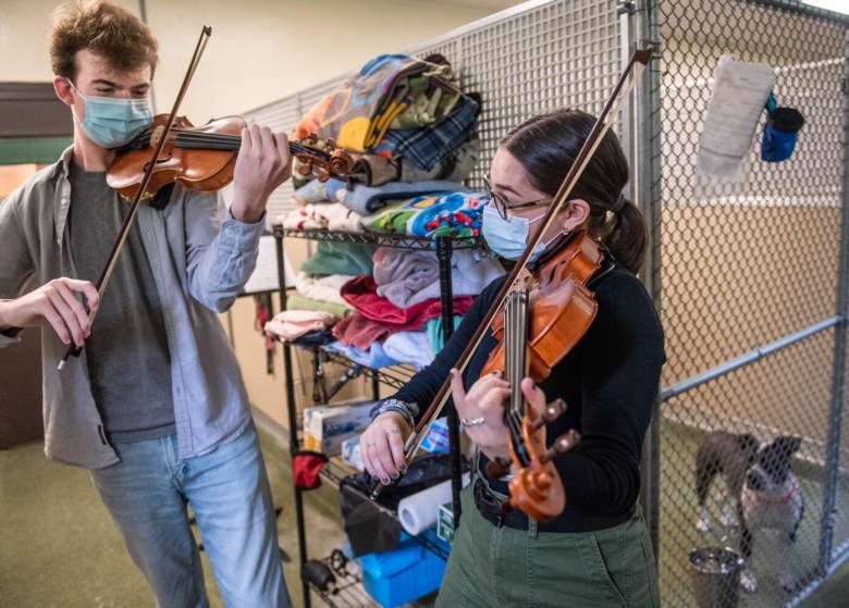 Maddy Ewell and Riley Gramley filed into a narrow corridor, led by operations manager Ken Schlichting, their violin cases, stands, and sheet music in hand, and set themselves up before a row of dogs poking their noses through their cages. Cutting through the barrage of barking was “6 Violin Duos” by the Austrian-French composer Ignaz Pleyel, followed by scattered whines and wide eyes.