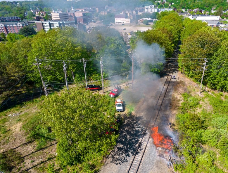 Firefighters responded shortly after 9 a.m. to a call of used railroad ties burning next to railroad tracks. The blaze had spread from a small brush fire about 10 feet away and was extinguished in 20 minutes, Flanagan said.