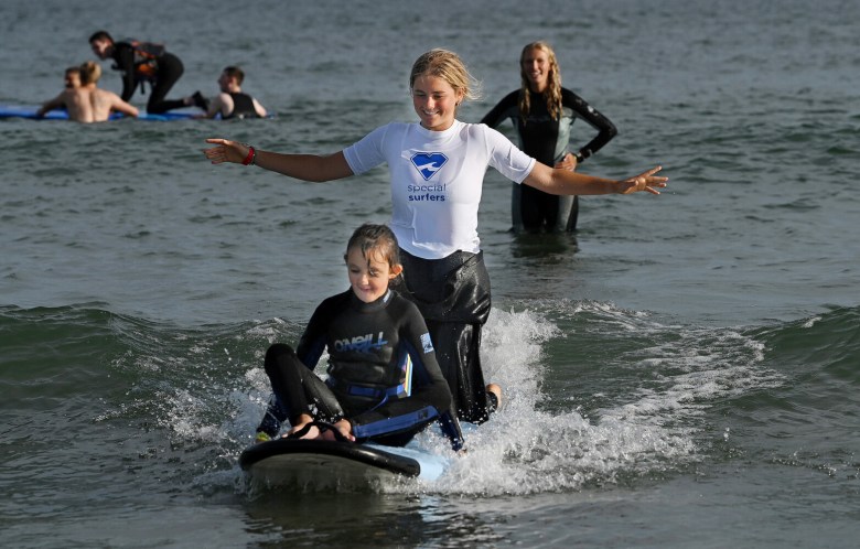 Tuesday’s gathering broke attendance records with about 250 surfers and nearly 400 volunteers hitting the beach, said Nanci Boutet, founder and executive director of Special Surfers. “The volunteers want to come every year, they move heaven and earth to come again,” Boutet said.