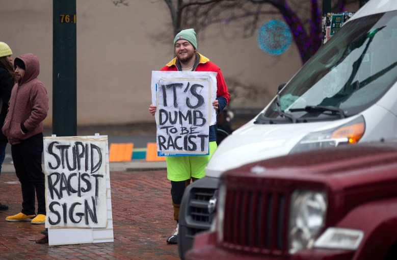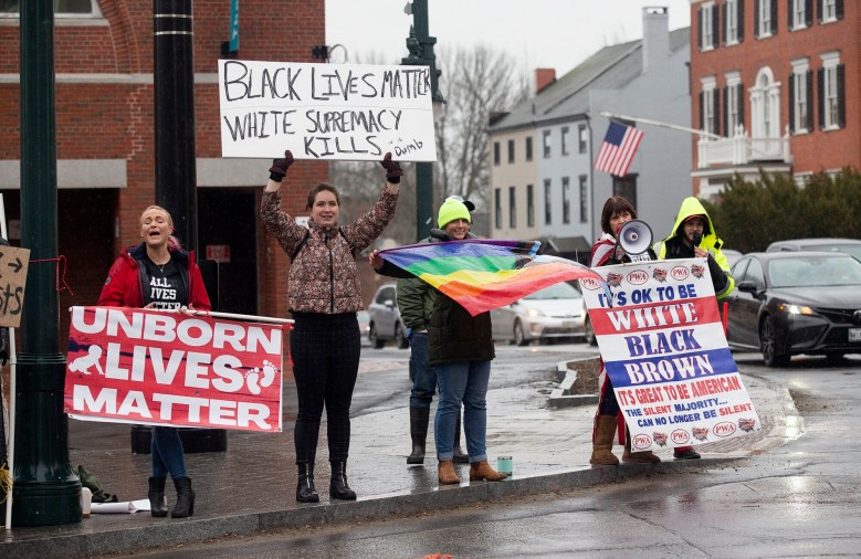 About 40 people spread out at the four corners of the intersection of High and Congress streets around lunchtime Friday, holding signs that read, “Stupid racist sign” and “Black lives matter,” and well outnumbering the handful of people rallying behind the banner.