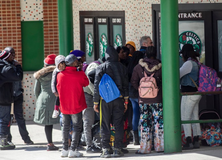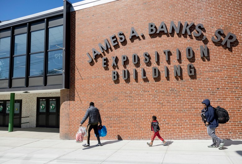 Asylum seekers who have been staying in overflow space at the city’s Family Shelter or in a temporary shelter set up at a middle school gym were transferred Monday afternoon to the new shelter at the Expo. They arrived in private cars, on foot and in city vans, and carried totes, trash bags and backpacks filled with belongings.
