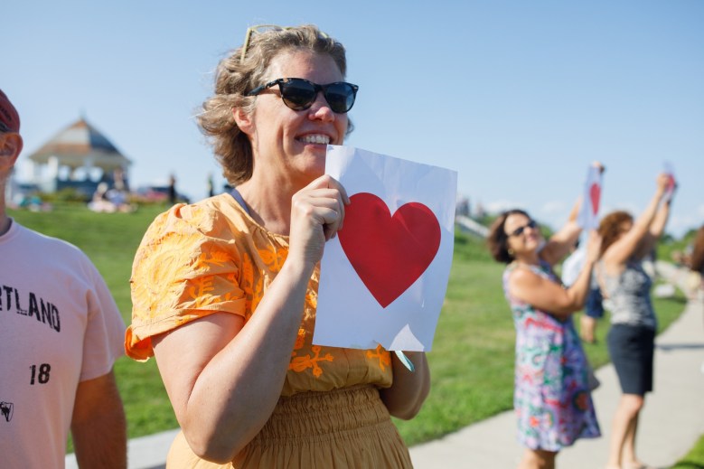 One of those people was Annie Darling of Cape Elizabeth, who brought her friend, Maggie Paul of Santa Cruz, California, to the granite steps of Bug Light, the 1875 lighthouse that the South Portland park is named after. Several dozen people watched the parade from the park.
