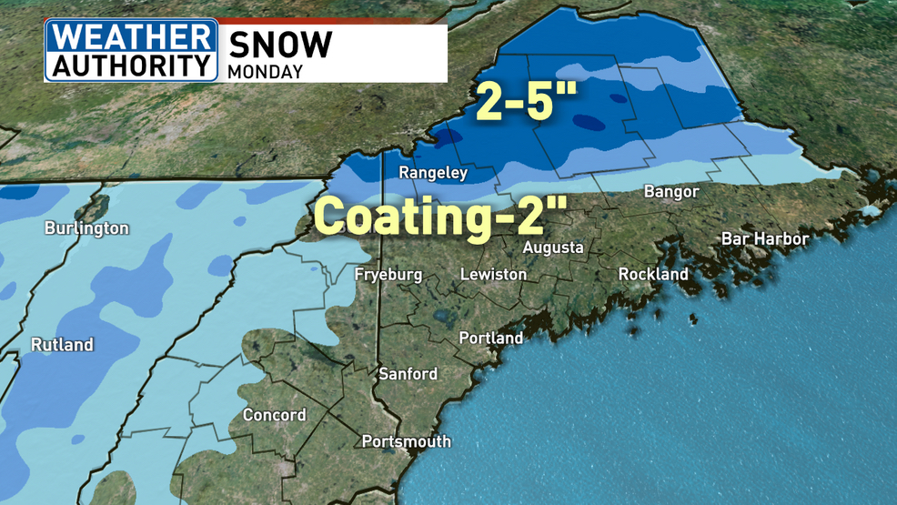 Maine will get rain most of Monday but the mountains can get a couple inches of snow.