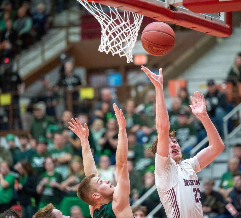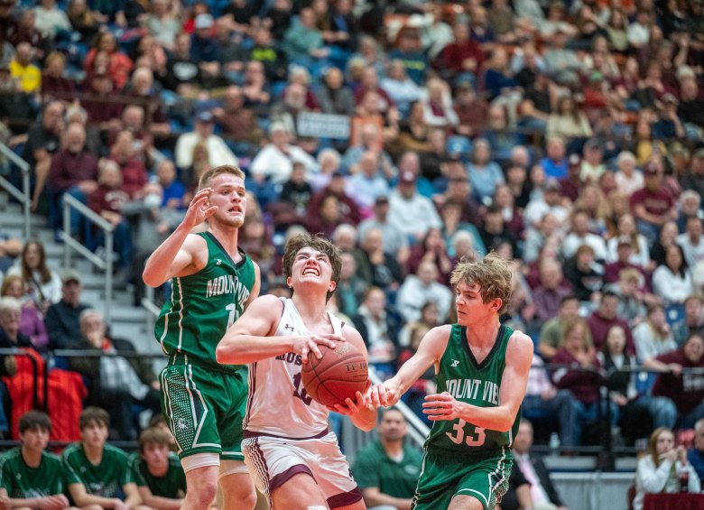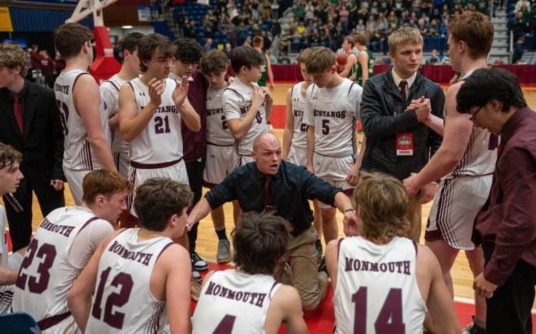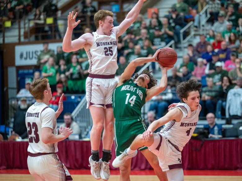 Monmouth and Mt. Abram battled until Lucas Harmon’s fourth-quarter heroics helped the Mustangs pull off a 46-43 victory to earn the school’s first boys basketball regional title.