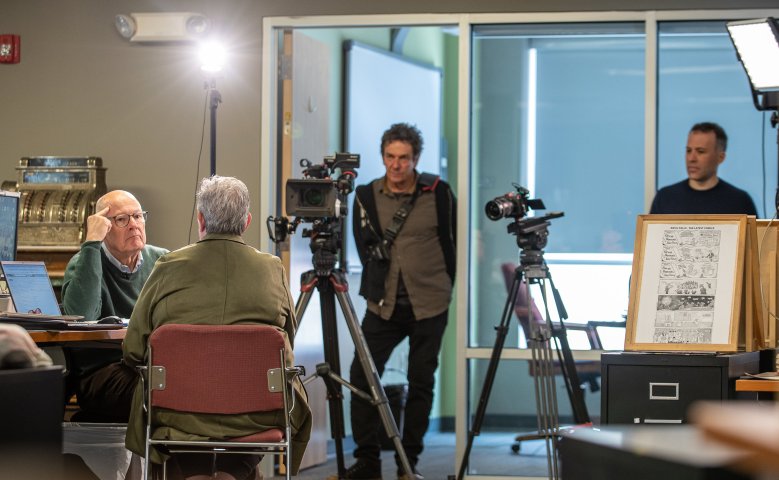Veteran NBC journalist Harry Smith, left, interviews Sun Journal Executive Editor Judith Meyer on Monday afternoon in the newsroom of the Lewiston newspaper. NBC Nightly News is doing a story on the critical impact of local journalism on communities across the country and the movement toward nonprofit newsrooms. The segment is scheduled to run Thursday on the NBC Nightly News with Lester Holt.