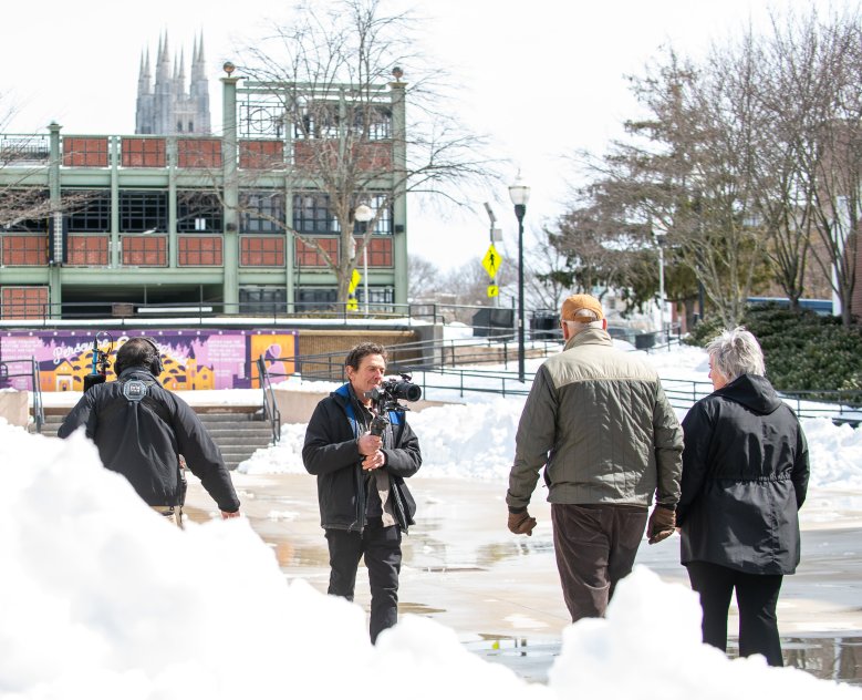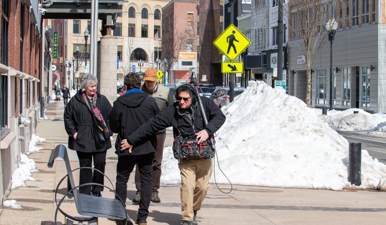 An NBC film crew walks with veteran television journalist Harry Smith Monday morning as he interviews Sun Journal Publisher Jody Jalbert in downtown Lewiston.