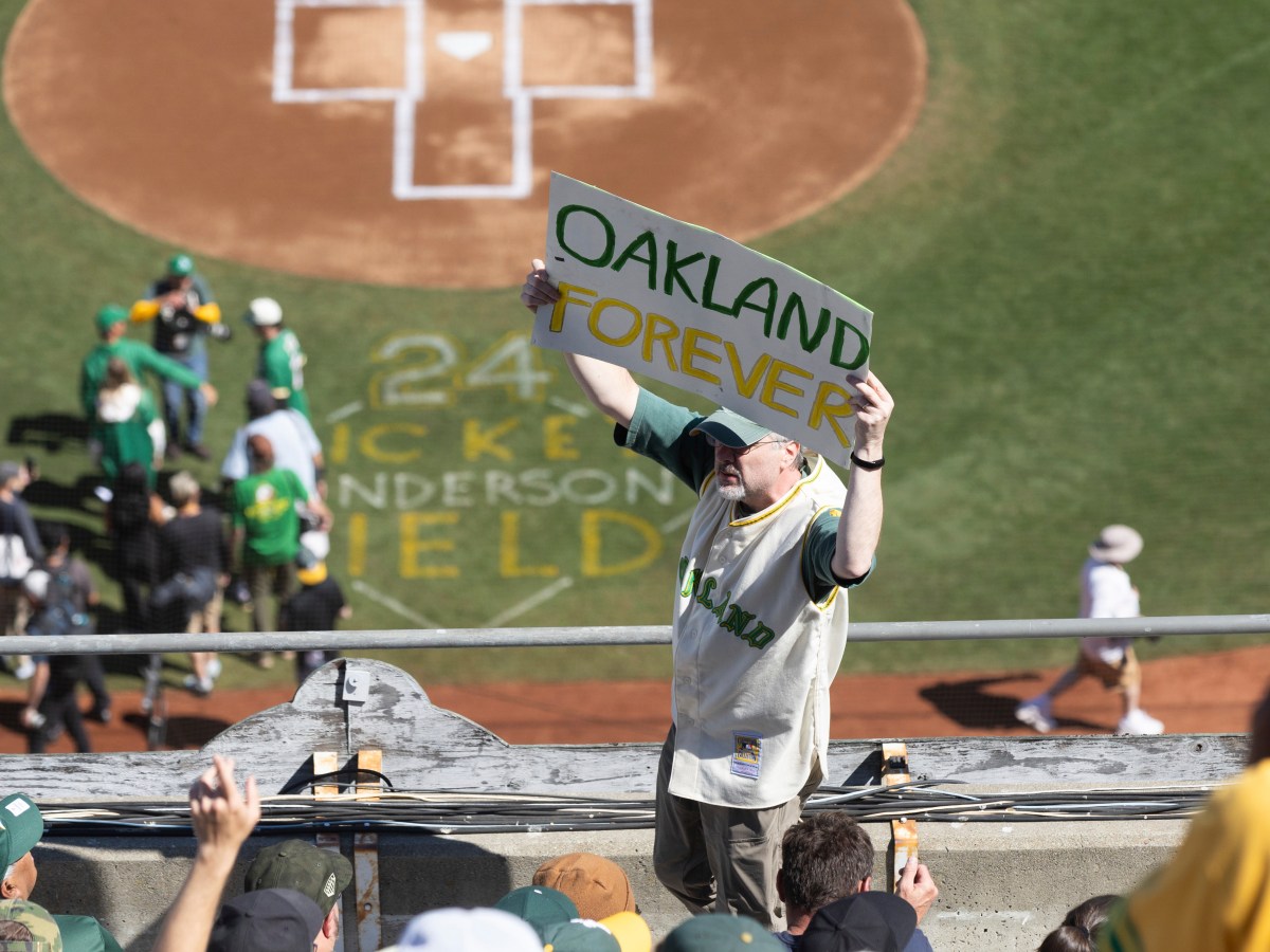 A sellout crowd of 46,889 cheer and jeer, as well as throw things on the field, as the A’s play their final game at the Coliseum before an eventual move to Las Vegas.