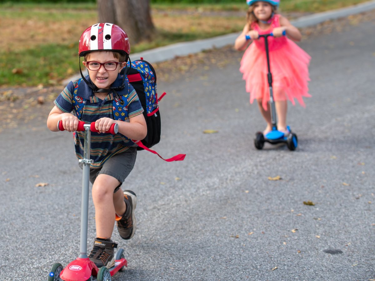 Siblings ride scooters while waiting for bus Thursday in Lewiston.