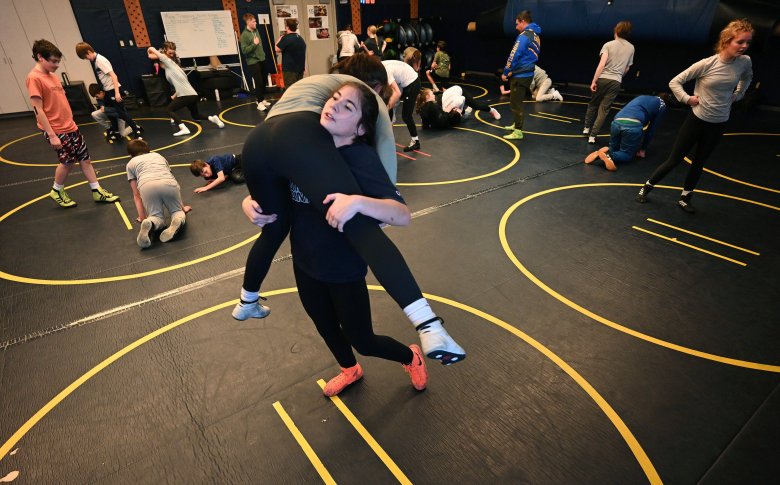 But behind those doors, the room is buzzing. It’s lined wall to wall with blue wrestling mats. Names of wrestlers from years past adorn yellow signs along the wall. A giant blue spotlight rests in the corner, painted yellow with the names of previous state champions. Male and female grapplers are jumping from drill to drill, absorbing a quick tutorial from third-year coach Mike Hansen before getting to work. Rap music plays loudly in the background.