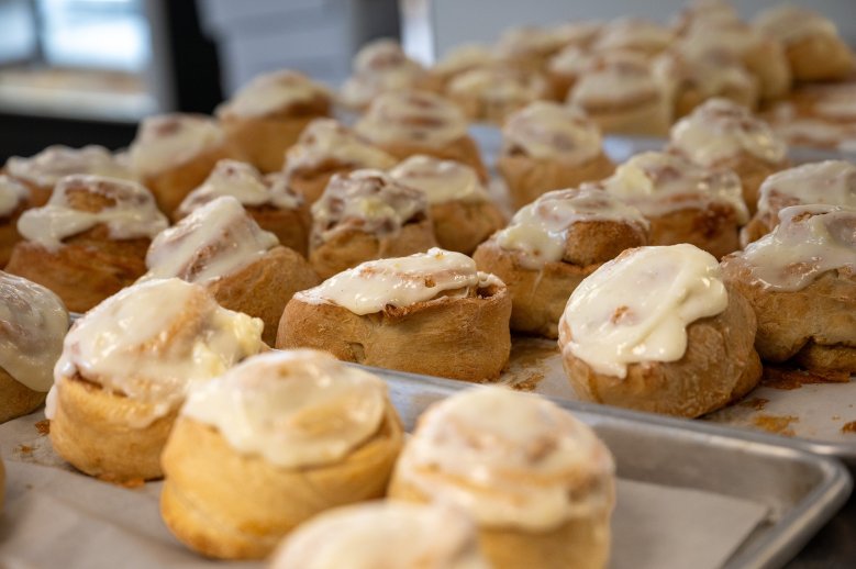 Cinnamon buns wait to be packaged Tuesday at the Greene Village Bakery, 17 Patten Road in Greene. Owner Rachel Bushey said it’s all she can do to keep products on the shelves.  Andree Kehn/Sun Journal