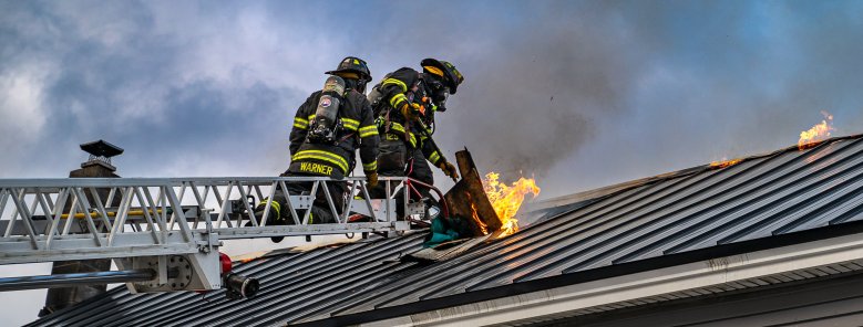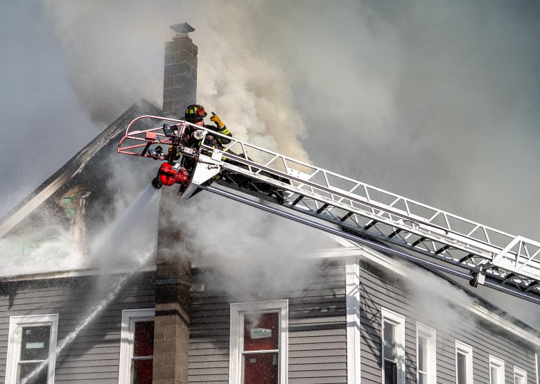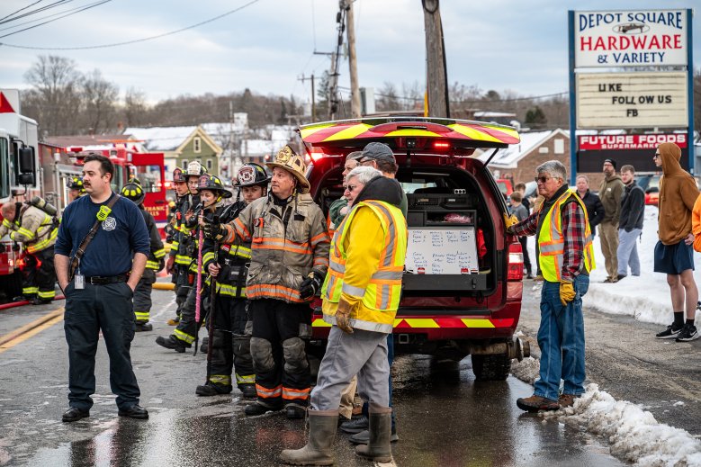 The first calls for a fire at 39 Pleasant St., near the Depot Square area, came at around 5 p.m. Minutes later smoke poured from the structure’s roof, crowned by orange flames.