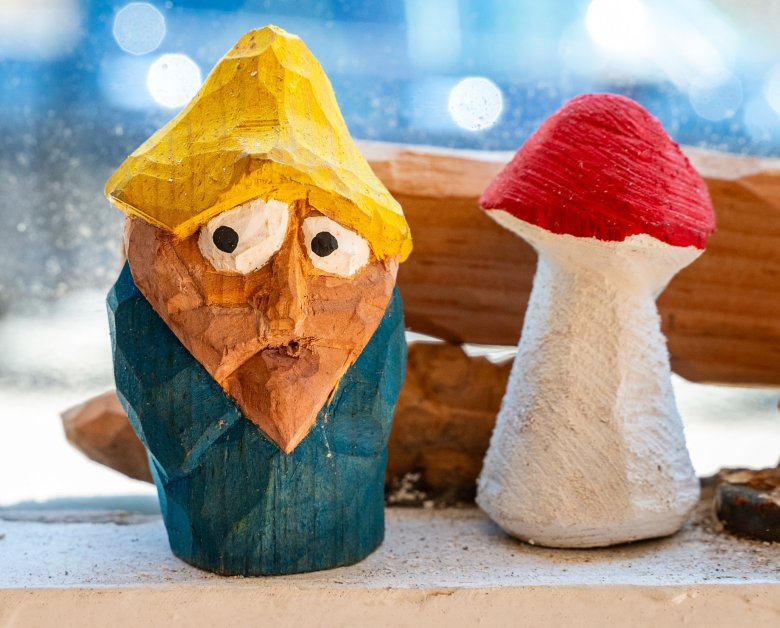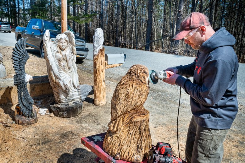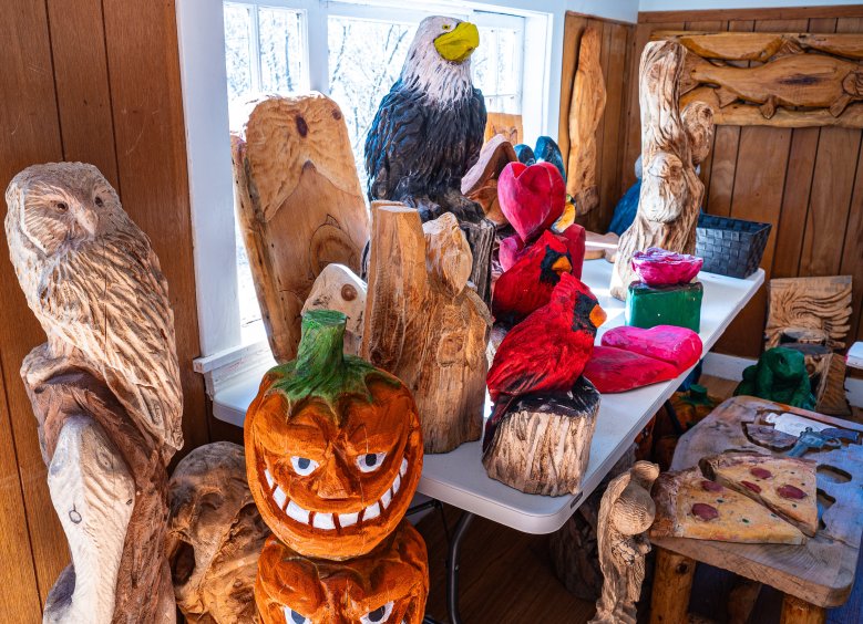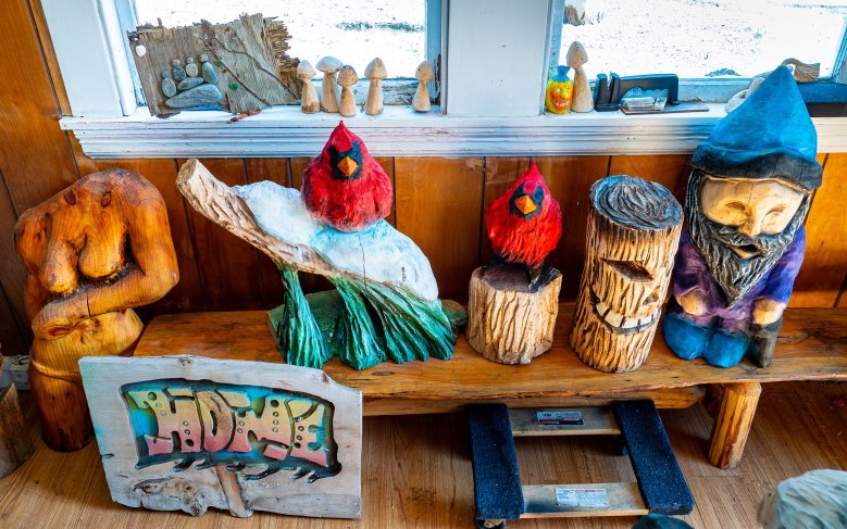 On Tuesday afternoon, he and some of his artwork were basking in the afternoon sun while he worked on an owl from a piece of wood he got from one of his neighbors.