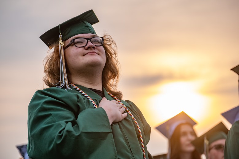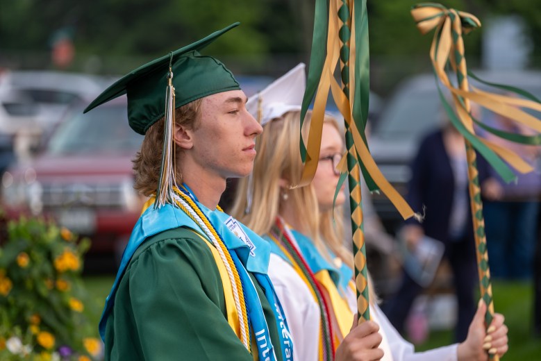 After a bagpiper led a processional of faculty members, the graduates marched two-by-two to “Pomp and Circumstance” performed by the school Concert Band.