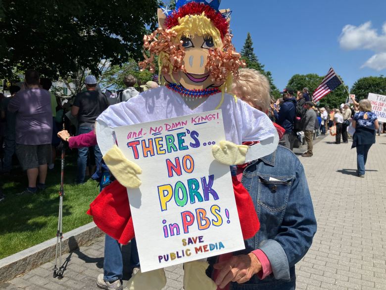 In Portland, thousands of protesters took to Monument Square and Lincoln Park, waving American and Mexican flags and carrying signs condemning “violence against the people” and “kings in America.” Among them was Mellony Beck, who came from Cape Elizabeth and worries about threats to women’s and gender affirming health care.