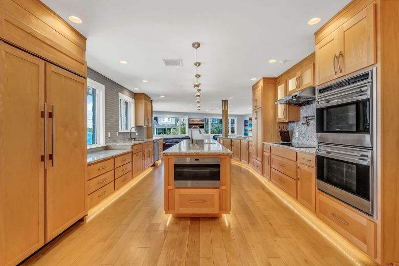 Experience unparalleled refinement with this completely customized estate with three bedrooms, six bathrooms and 3,671 square feet of living space. All finishes, from floors to cabinets, are maple. Glass tiles grace all of the bathrooms, each with their own colorway. In the chef’s kitchen are hand-crafted countertops and backsplash, embedded with seaglass and seashells. The primary bedroom suite features a steam shower with bench and dressing room with towel warmers.