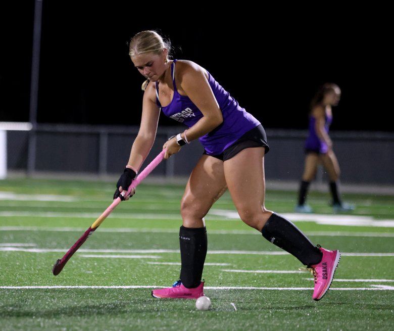 Senior Anna Johnson runs through drills during the Biddeford field hockey team's midnight practice early Monday morning. (Derek Davis/Staff Photographer)