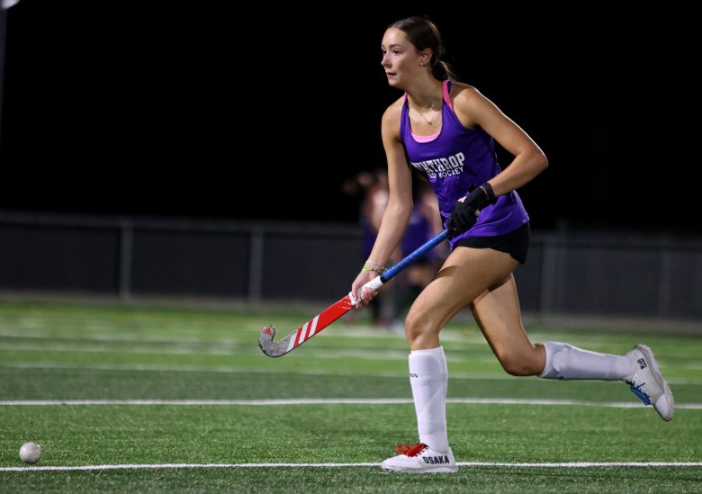 The Winthrop field hockey team plays during a midnight preseason practice Monday in Winthrop. (Anna Chadwick/Staff Photographer)