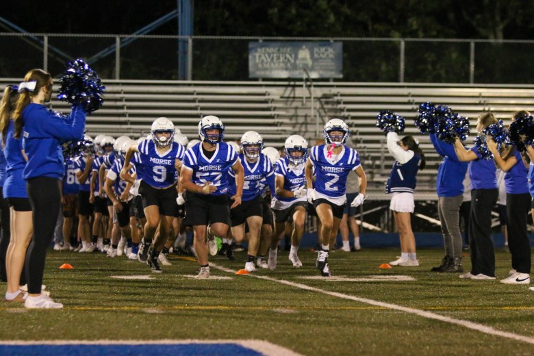 The Morse football team runs onto McMann Field between rows of cheerleaders after the clock strikes midnight Monday morning for the first official practice of the 2025 fall season. (Cooper Sullivan/Staff Photographer)