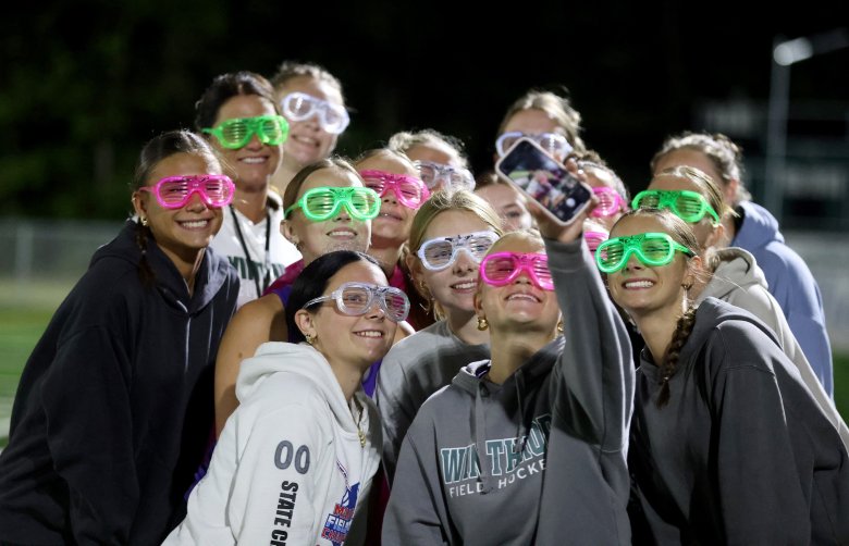 The Winthrop field hockey players take a selfie with glow-in-the-dark glasses on prior to their midnight practice to start the first day of preseason Monday in Winthrop. (Anna Chadwick/Staff Photographer)