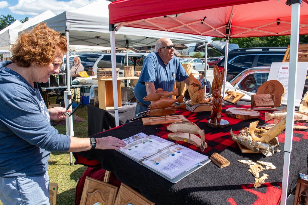 Deb Favreau, left, and her husband, Dave, check out the carvings at John Hooper’s Fin, Fur, and Feather Carvings booth Thursday at the Blueberry Festival at Town Cove Park in Rangeley. (Russ Dillingham/Staff Photographer)