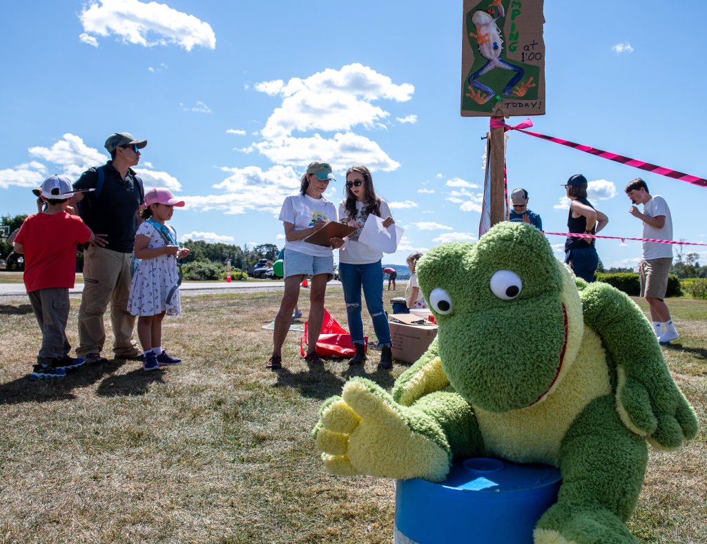 Frog Jumping Contest organizer Elizabeth Pimentel, middle left, and volunteer Juno Knox tabulate results to establish the winners in Thursday’s Frog Jumping Contest during the Blueberry Festival at Town Cove Park in Rangeley. (Russ Dillingham/Staff Photographer)