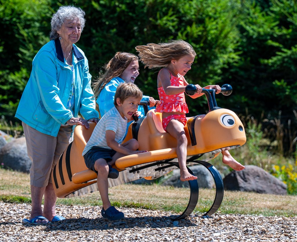 Phyllis Archambault, left, pushes her grandchildren Thursday morning in Rangeley Town Cove Park during the annual Blueberry Festival in Rangeley. With Archambault are Aliza, Adrian and Amaya Luneau, on vacation from Vermont. (Russ Dillingham/Staff Photographer)