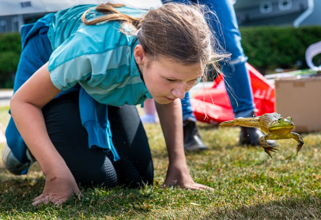 Lily Stevens watches as her frog, Fred the Second, jumps Thursday afternoon during the annual Frog Jumping Contest at the Blueberry Festival at Town Cove Park in Rangeley. Fred’s three jumps were the longest of the competition. (Russ Dillingham/Staff Photographer)